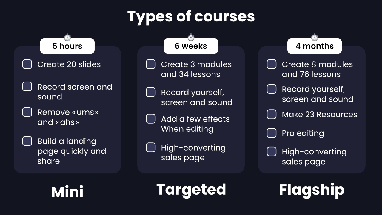 - Les mini-formations, dont la création peut prendre de quelques heures à 2 semaines, correspondent à des produits bon marché, des lead magnet, des cadeaux ou des bonus.