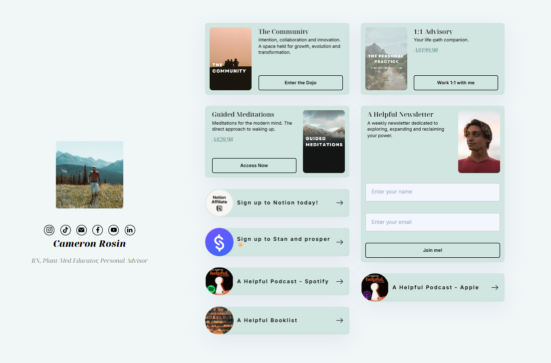 Start with a solid bio + one good landing page. Make sure people know what you do, see the value, and can easily say yes. Once that works, you can layer in extras (bonuses, high ticket, membership, etc.)