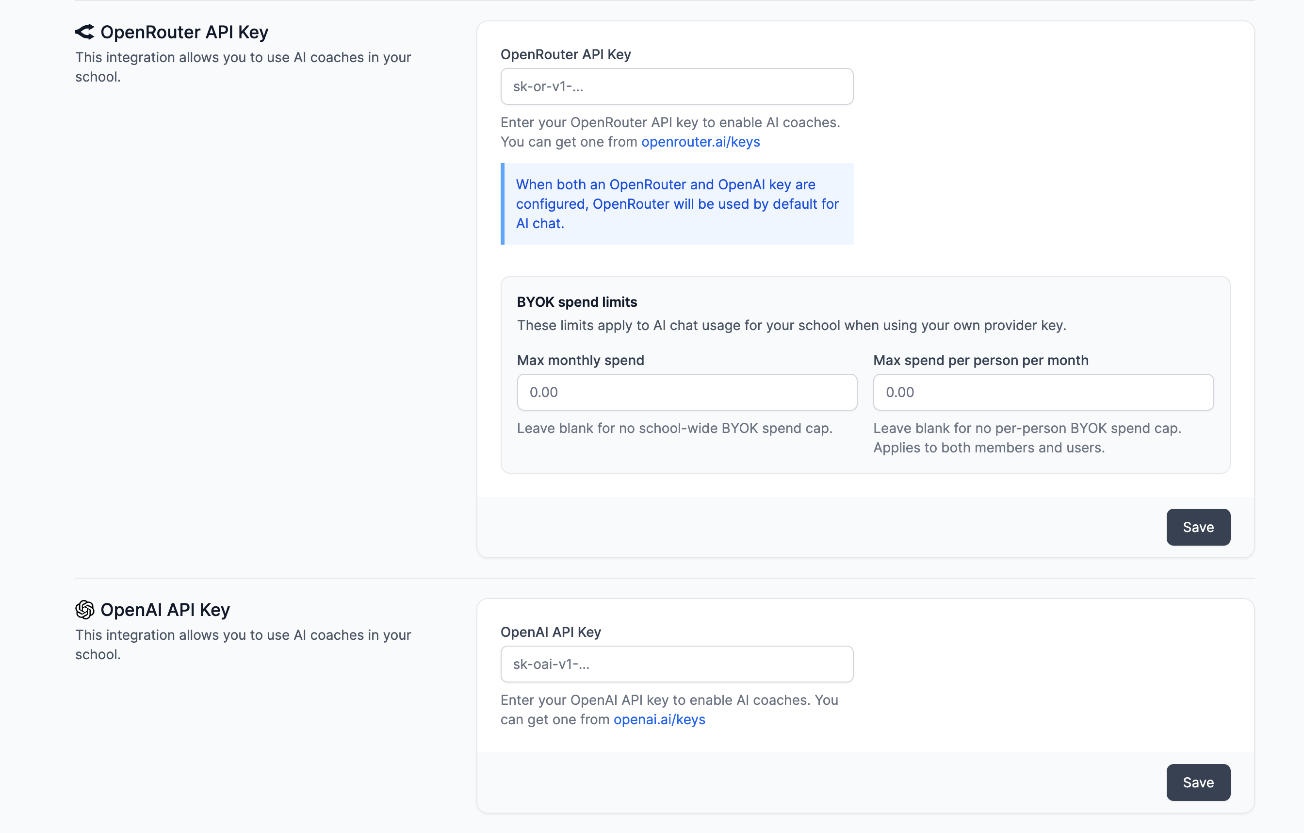 Bring your own API keys: You can now use your own API key for the AI coach via the integrations page.